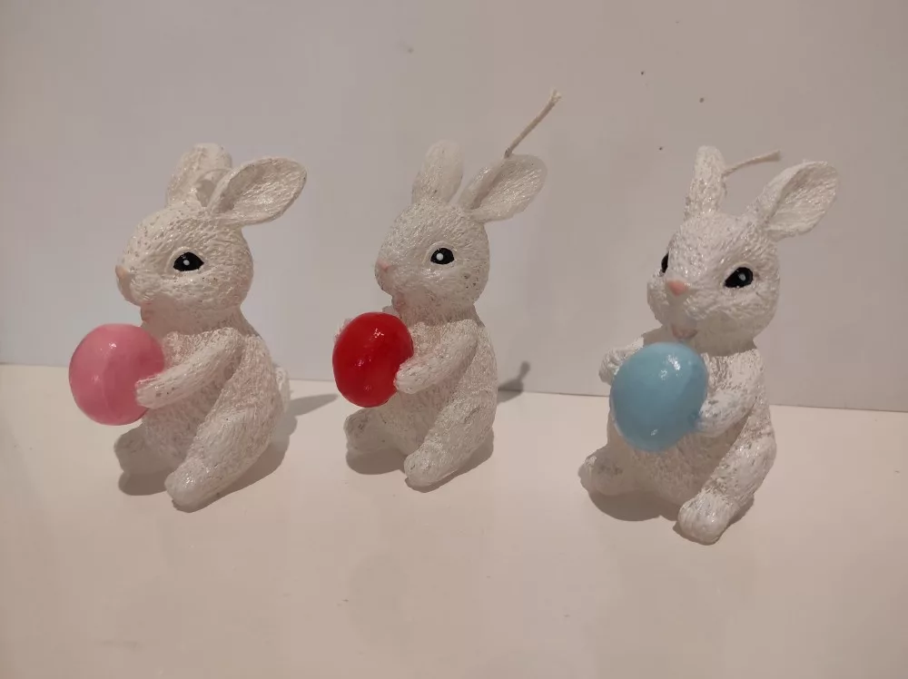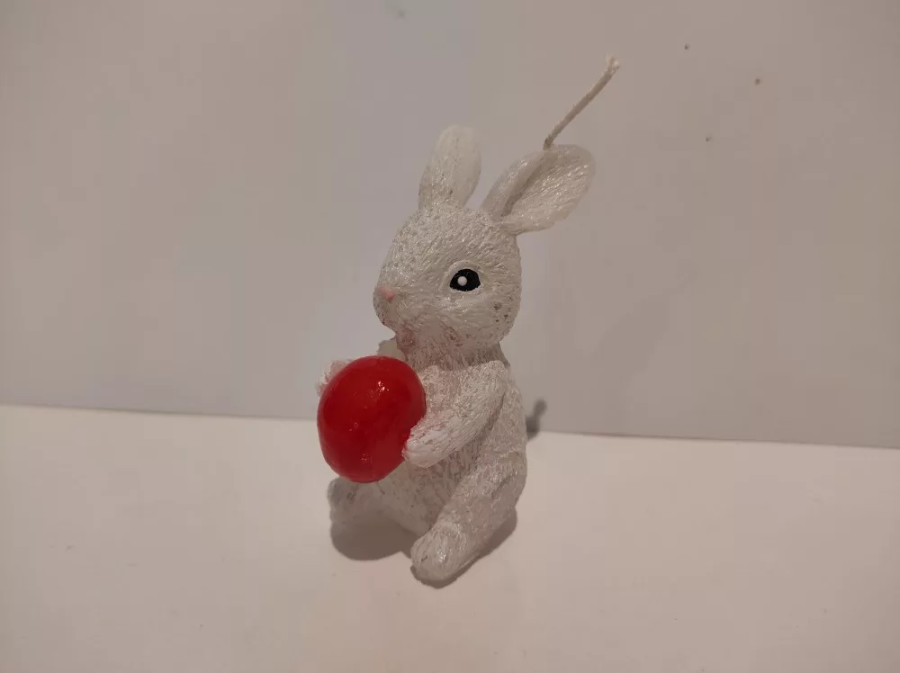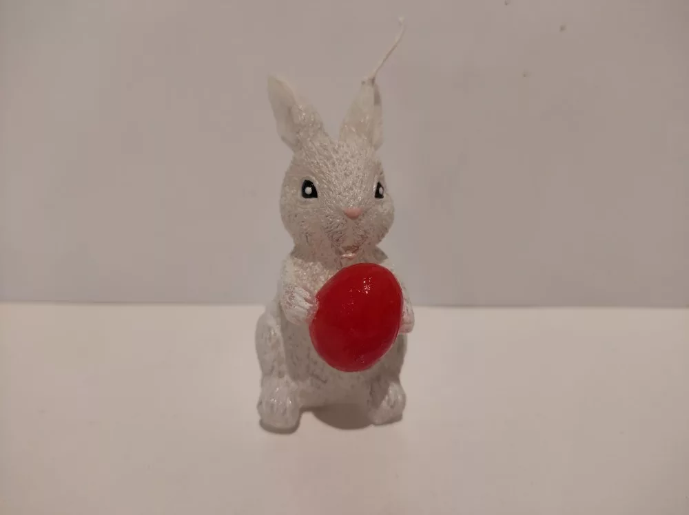 Nyuszi gyertya tojással a kezében. A tojás színe változtatható.